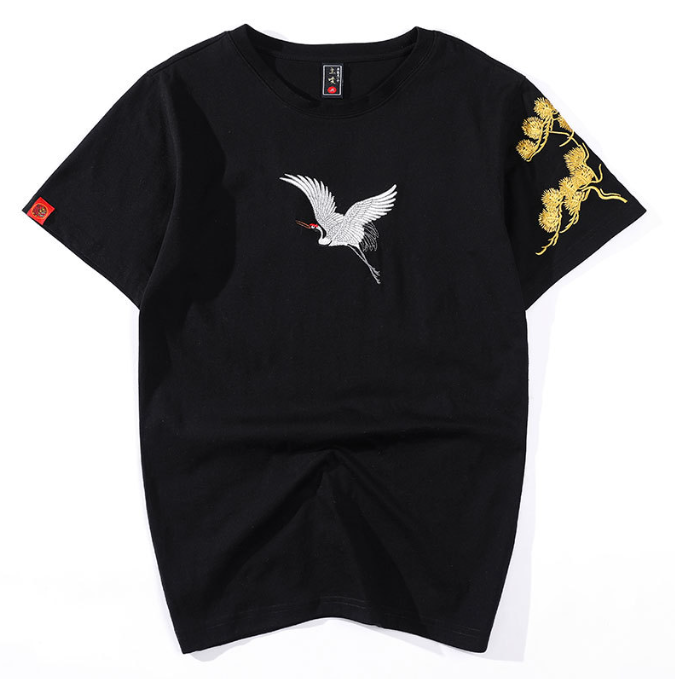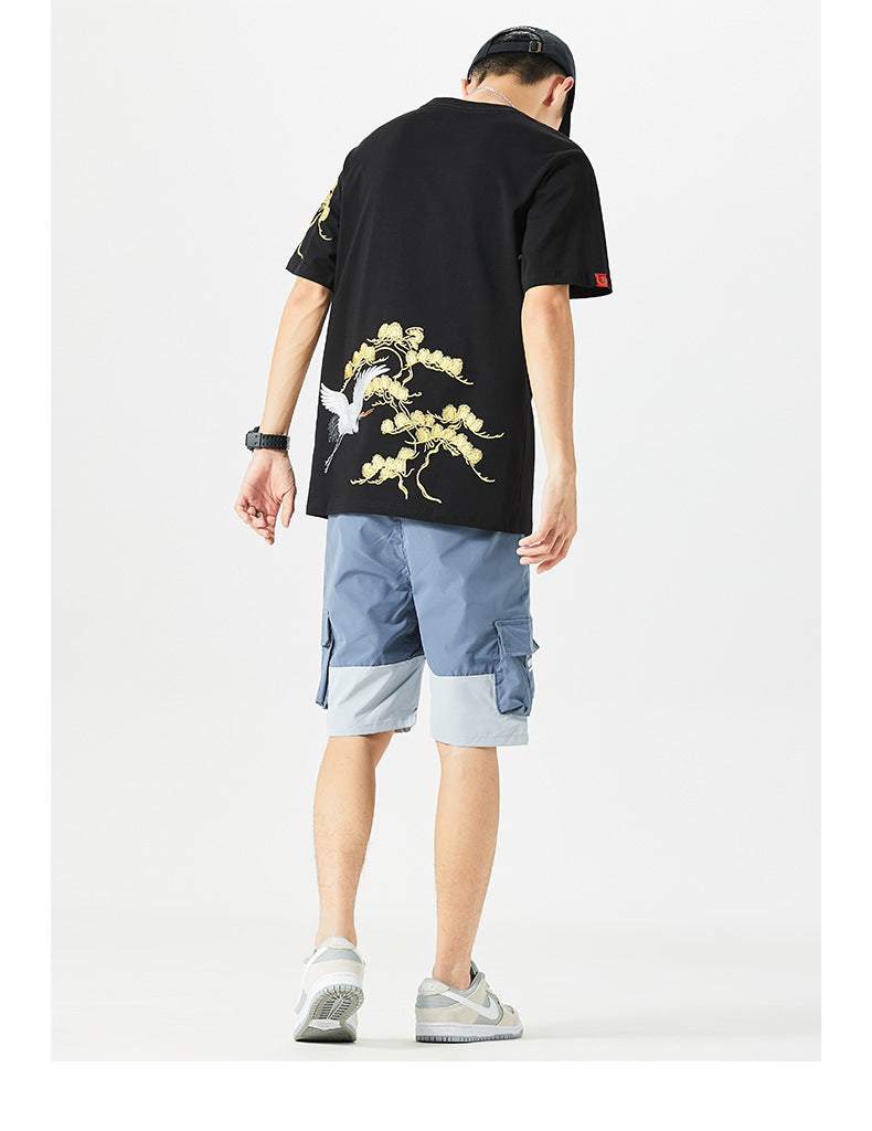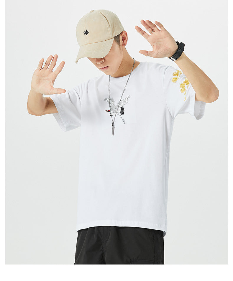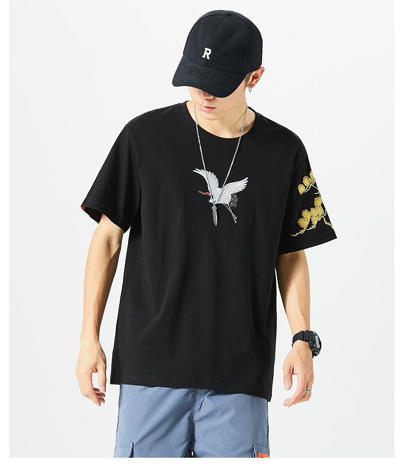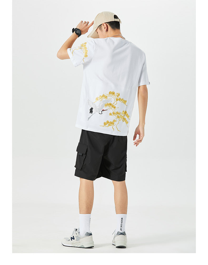 Chinoiserie Heavy Industry Embroidery Songhe China Chic Cotton Casual Loose Size Couple Short Sleeve T shirt Male