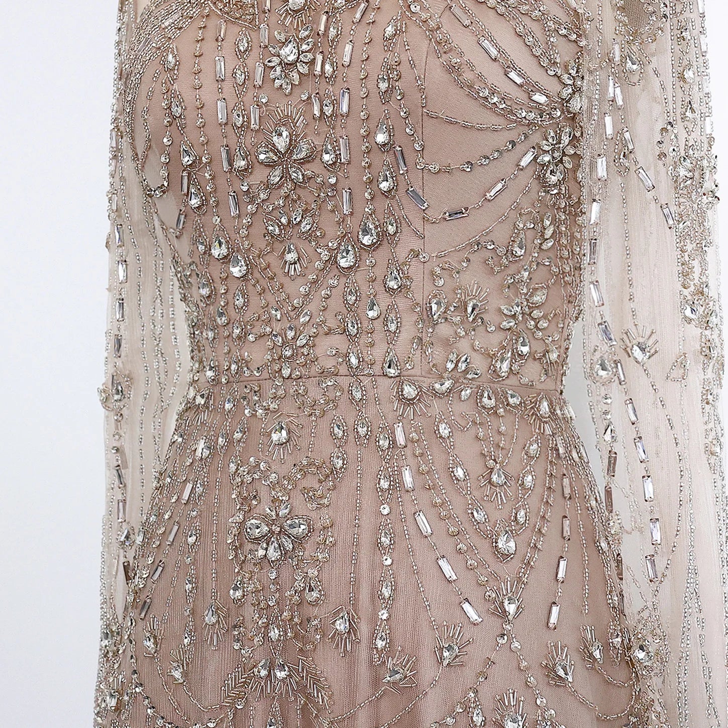 Step into sophistication with this evening dress, gracefully adorned in shimmering beads and exquisite crystal detailing. Crafted by Sharon Said, this modern style floor-length gown blends artistry with comfort, featuring a luxurious tulle fabric, built-in bra, and a naturally flattering A-line silhouette. The high neckline dress offers a regal elegance, while the full sleeves and sweep train gown create a dramatic silhouette for any formal evening occasion.