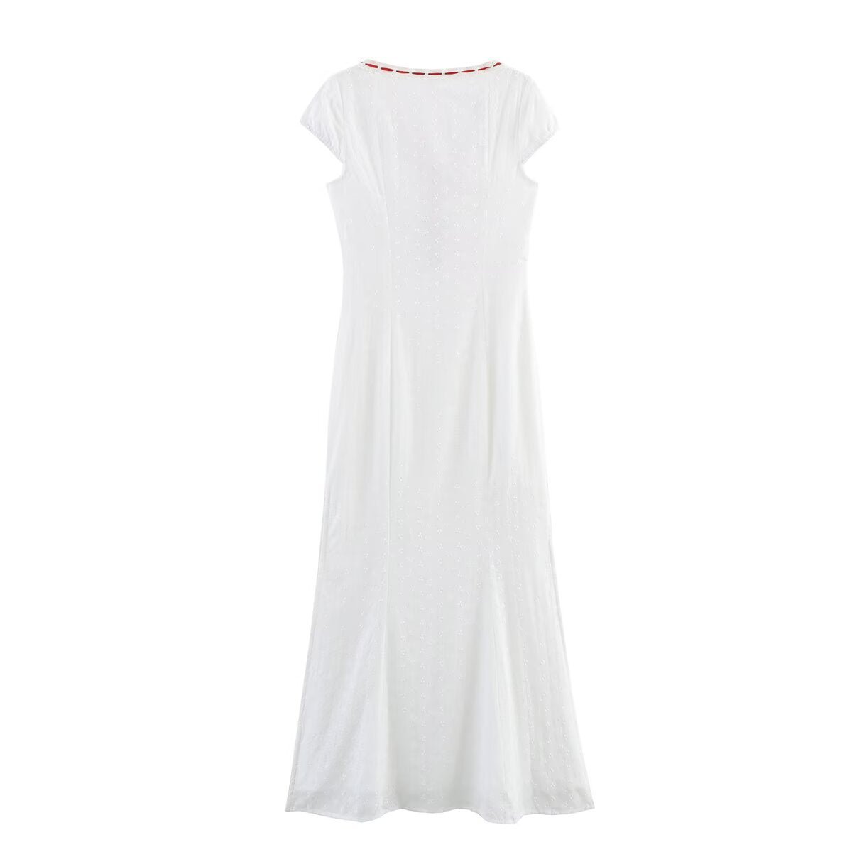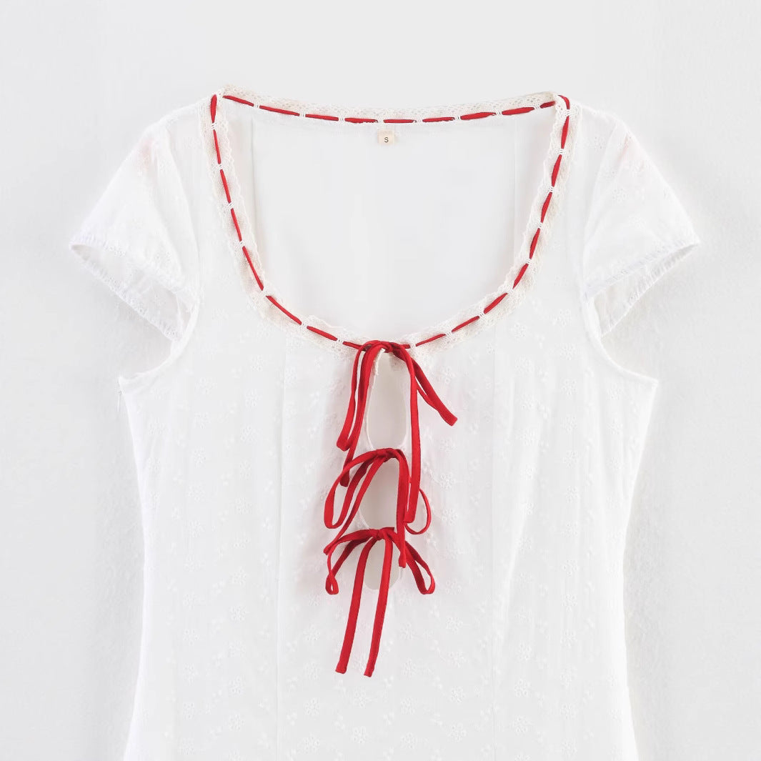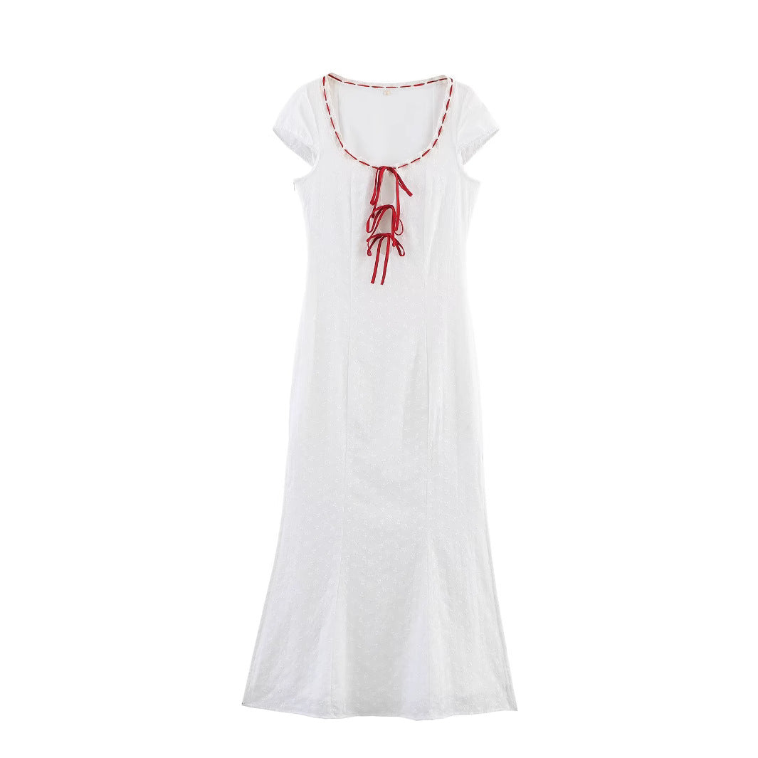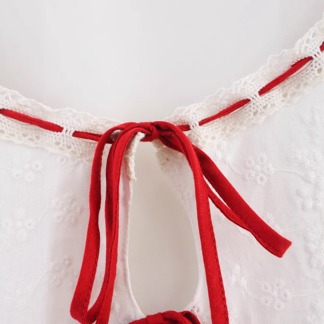 Fashion lace patchwork embroidered round neck lace up dress for women