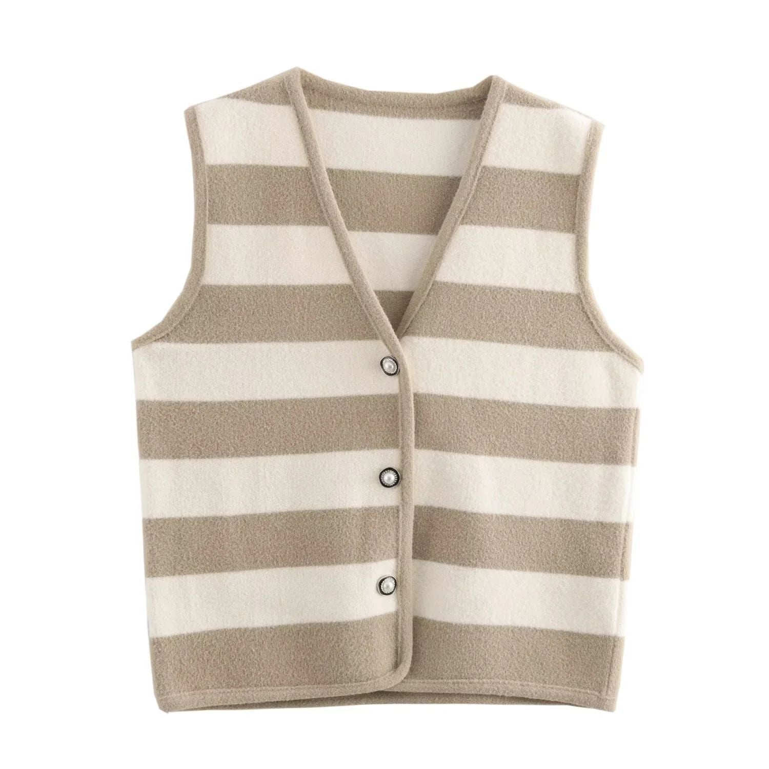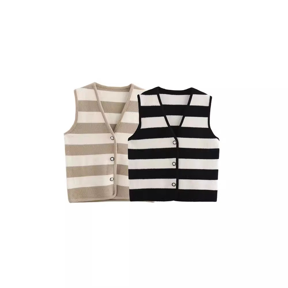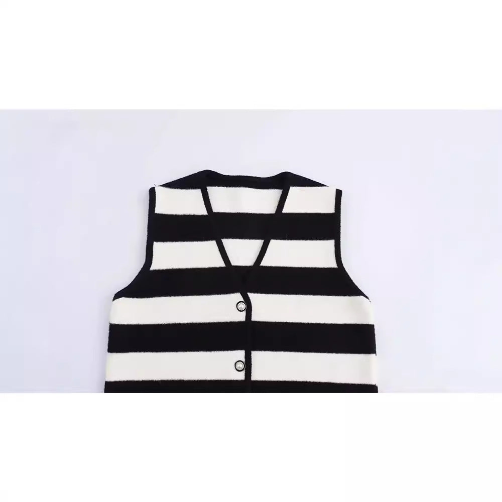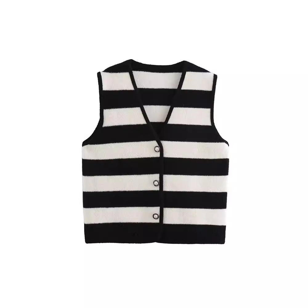 French style fashionable simple contrasting striped V-neck edging knitted vest