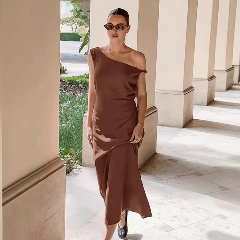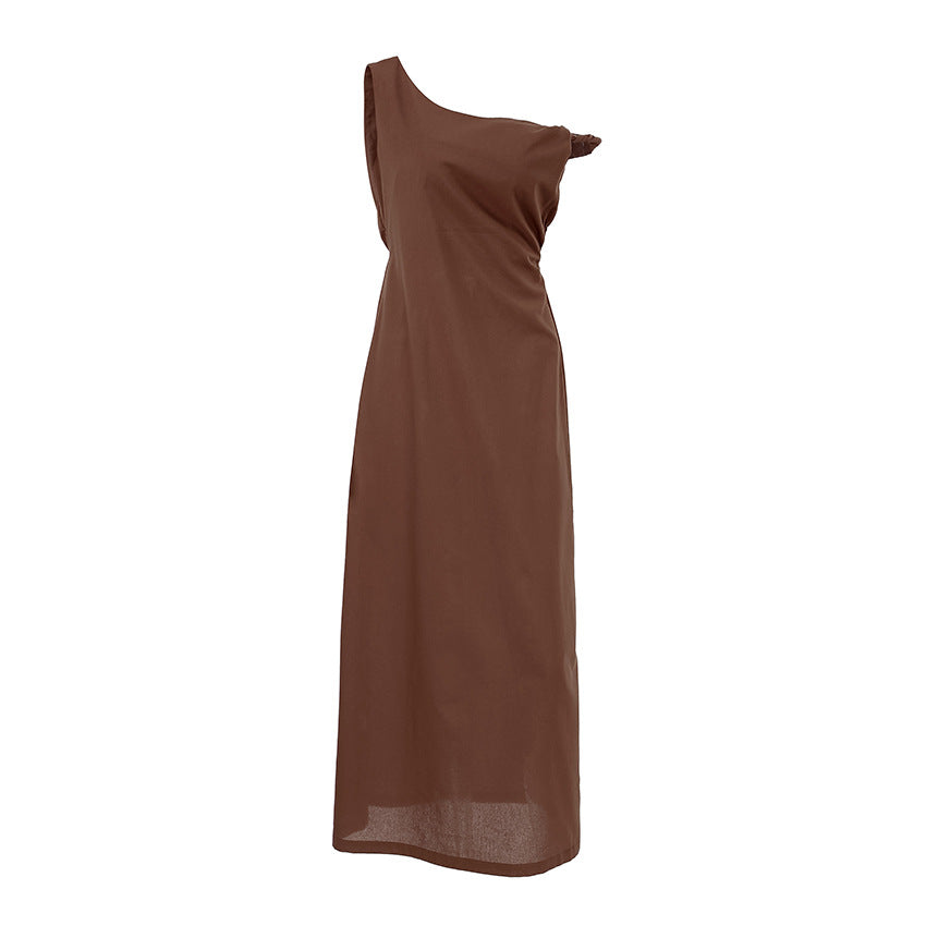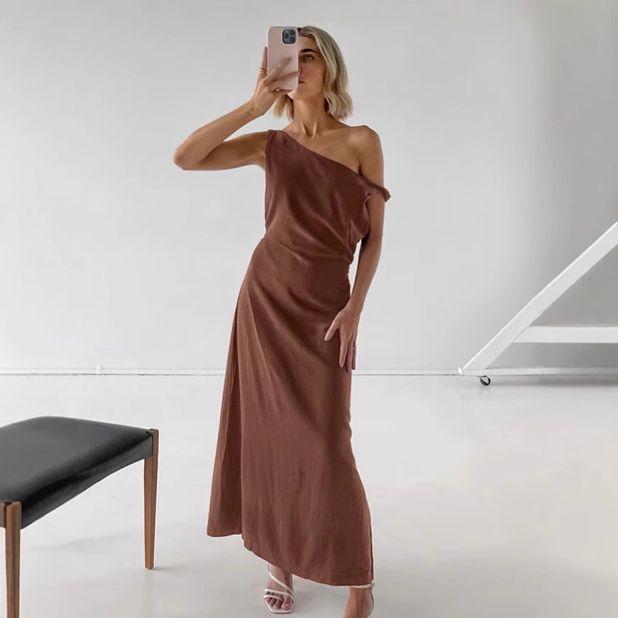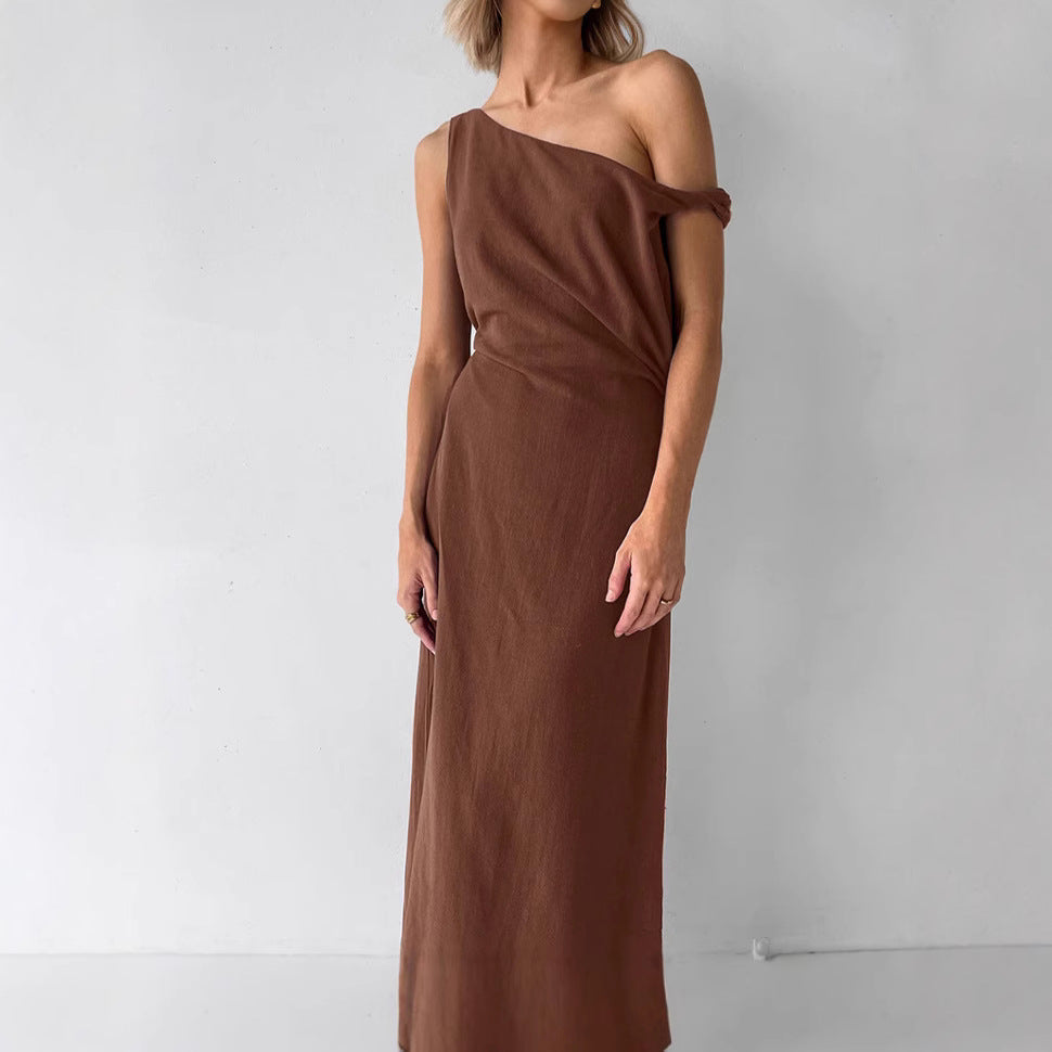 Off shoulder dress women's waist cinched diagonal collar cotton linen long skirt A-line skirt
