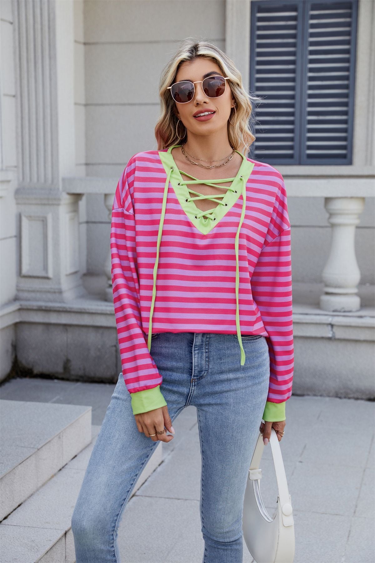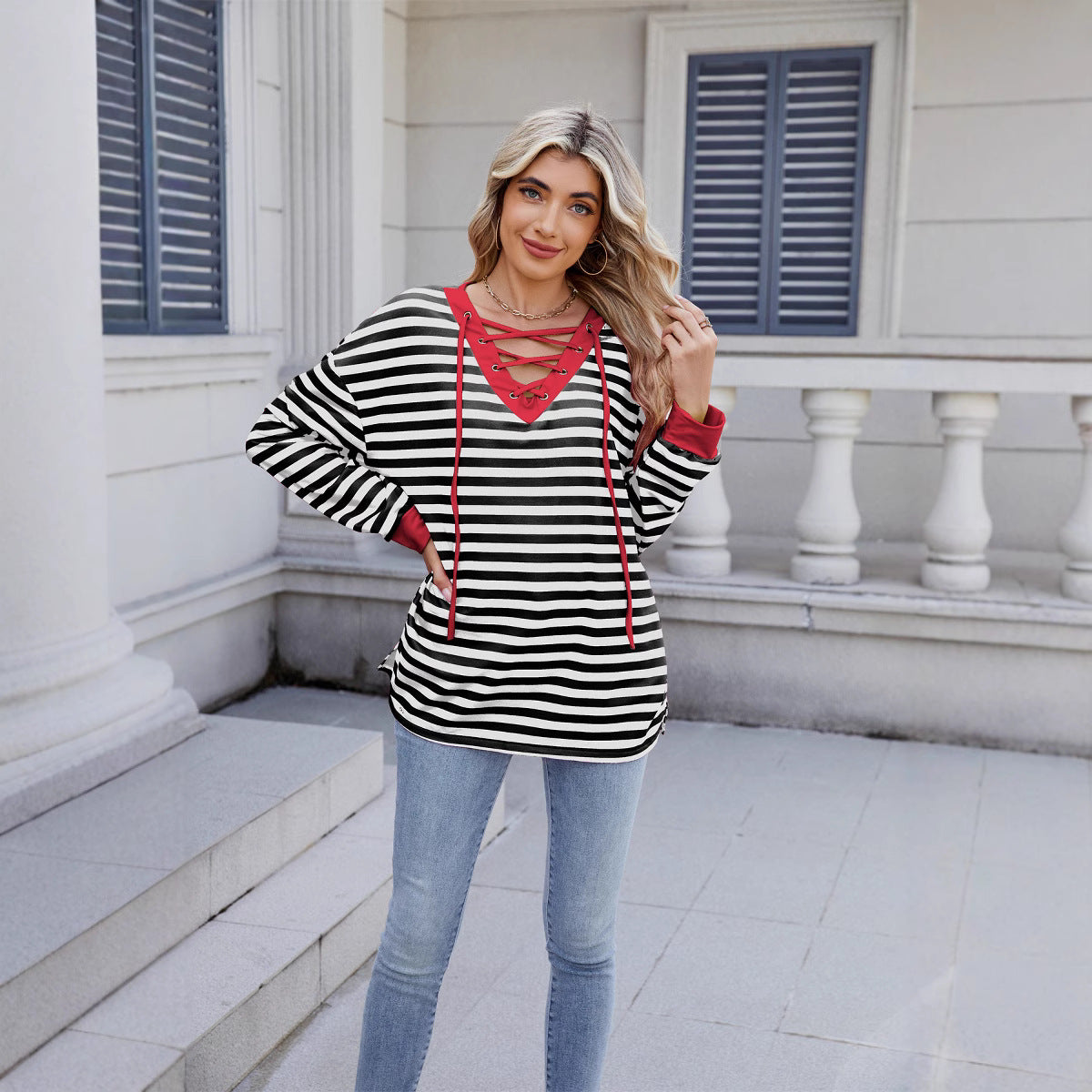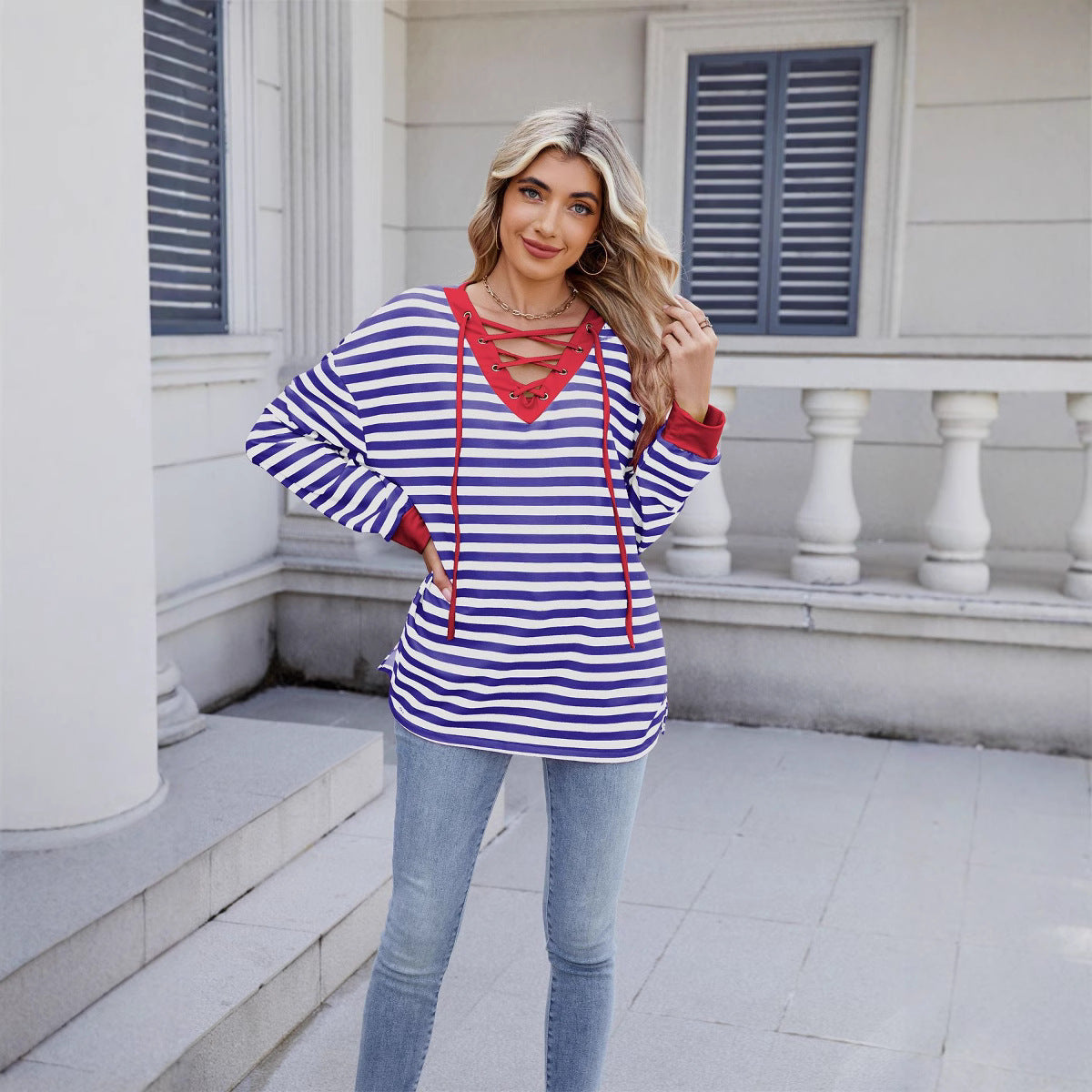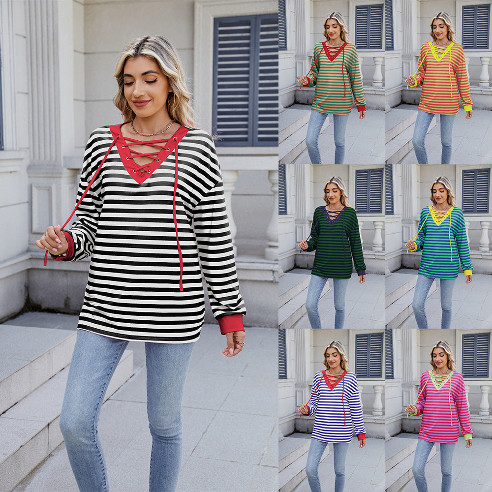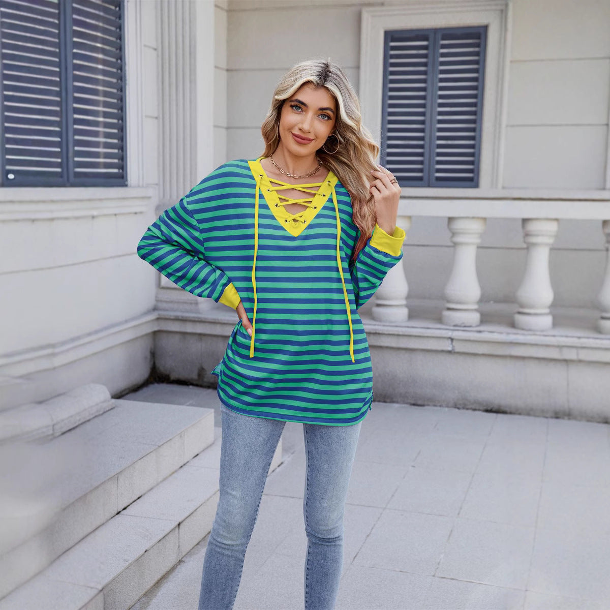 Anitrendy Women’s Striped V-Neck Long-Sleeve Hoodie with Belt Detail – Casual Fashion Pullover for All Seasons, Sizes S–2XL