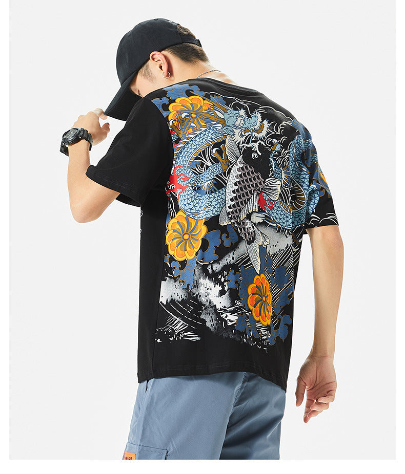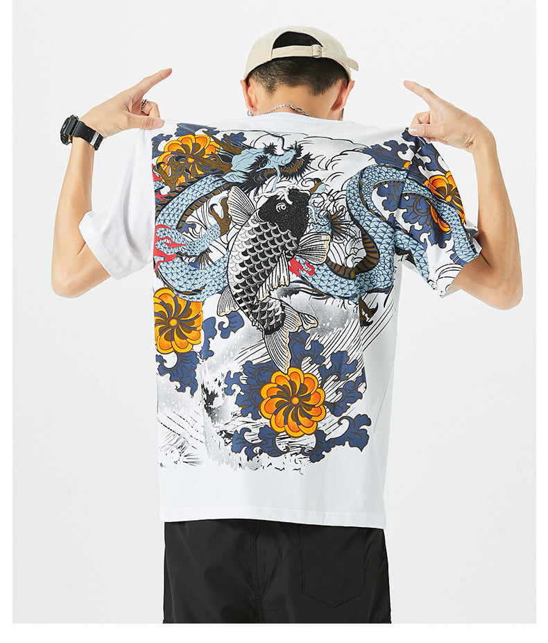 Summer New China Chic Carp Embroidery Short Sleeve T shirt Men Loose Large Cotton Half Sleeve Top Men Wear