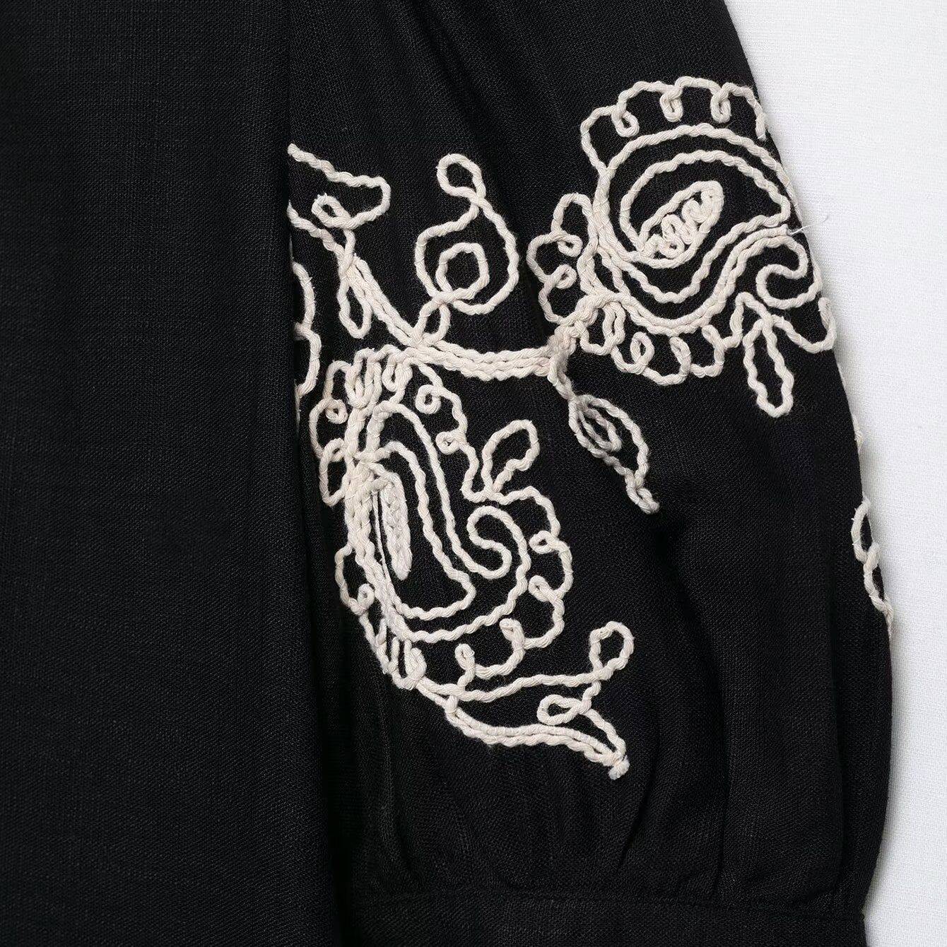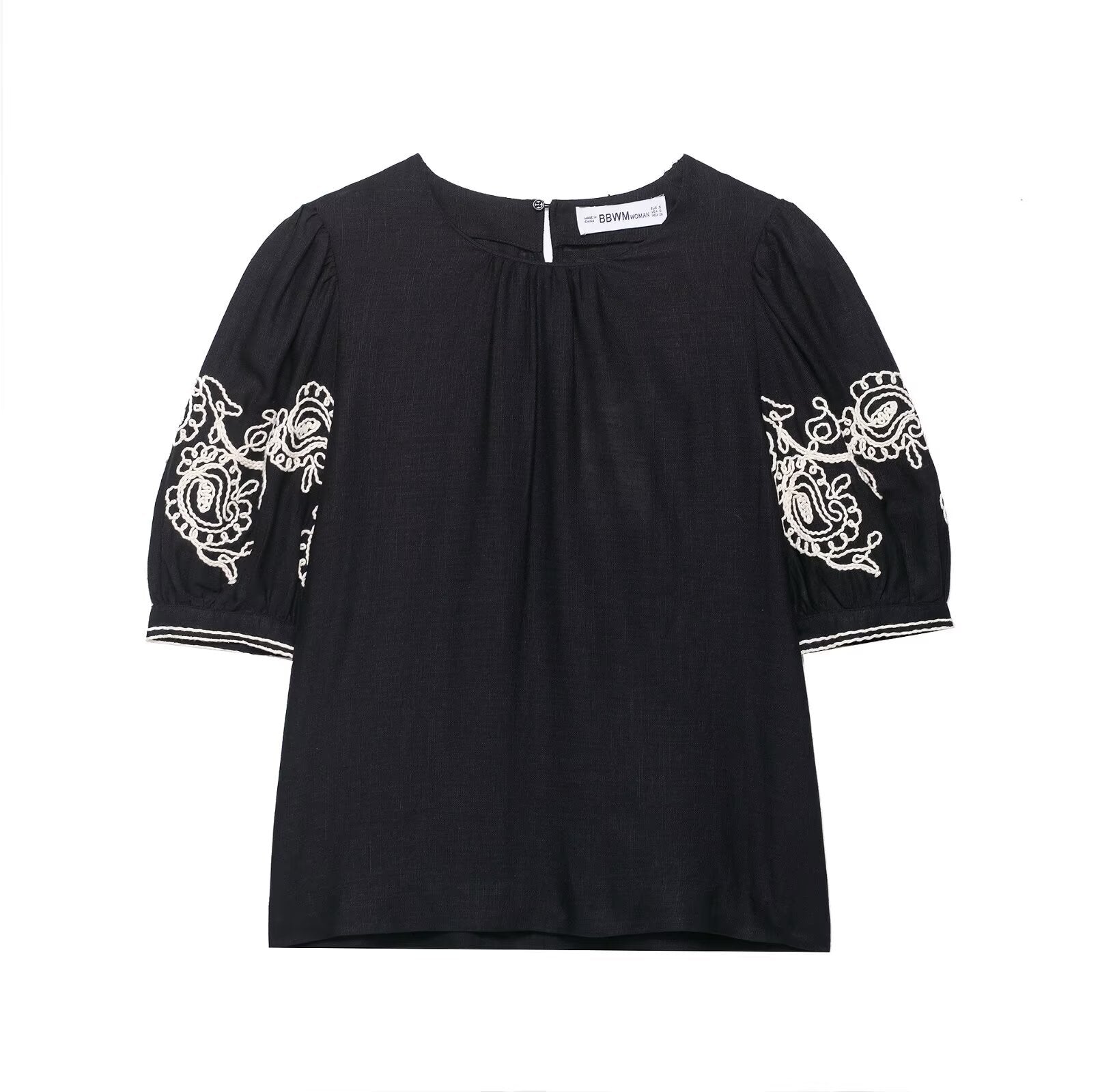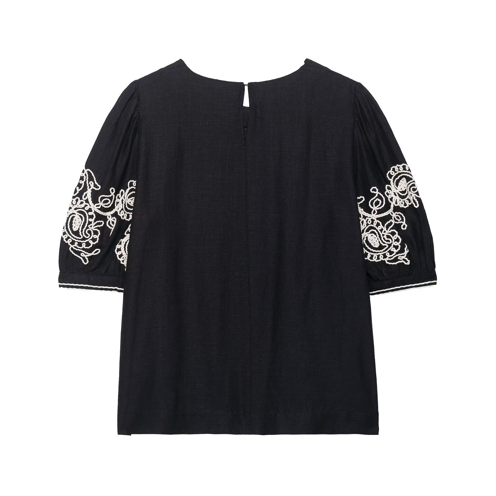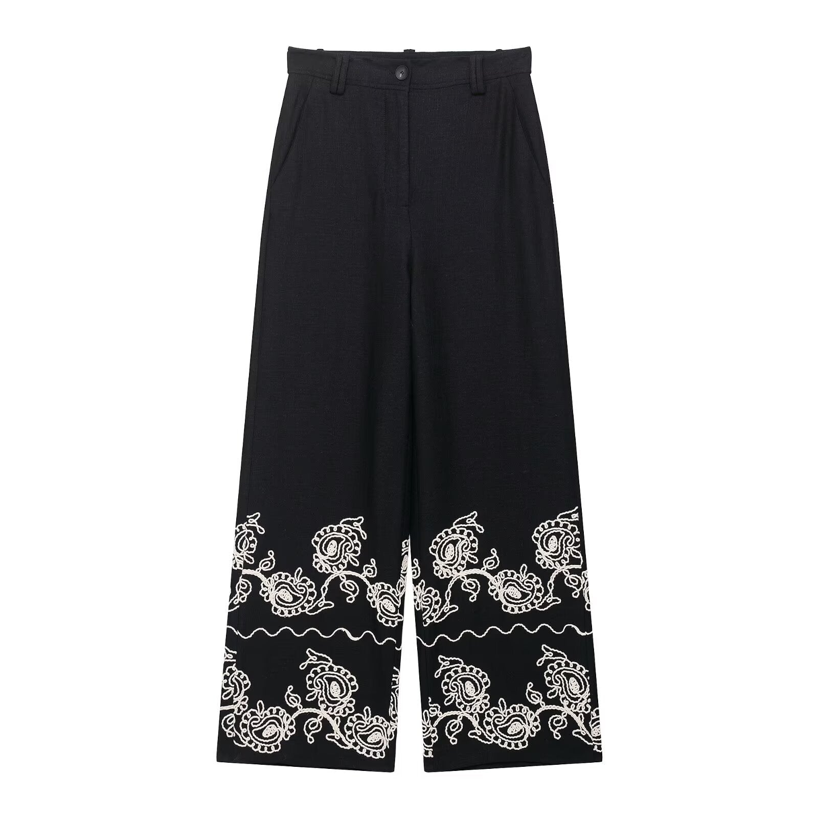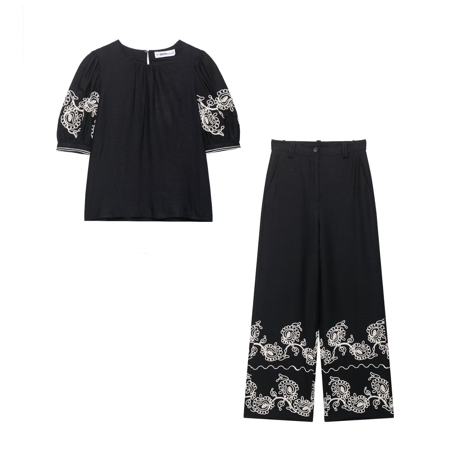 Women's European and American style round neck embroidered T-shirt+embroidered pants set