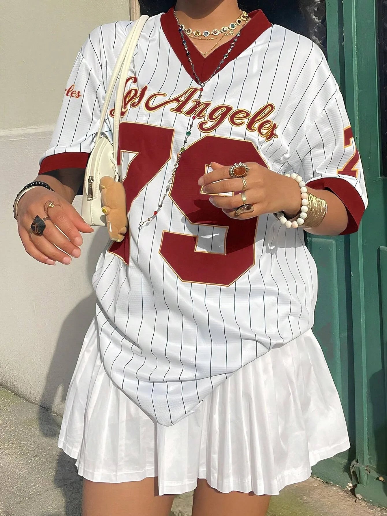 Women's Los AngelesLetter Print V-Neck Short Sleeve T-Shirt Summer Graphic Tee Baseball Jerseys Oversized Sport T-Shirt